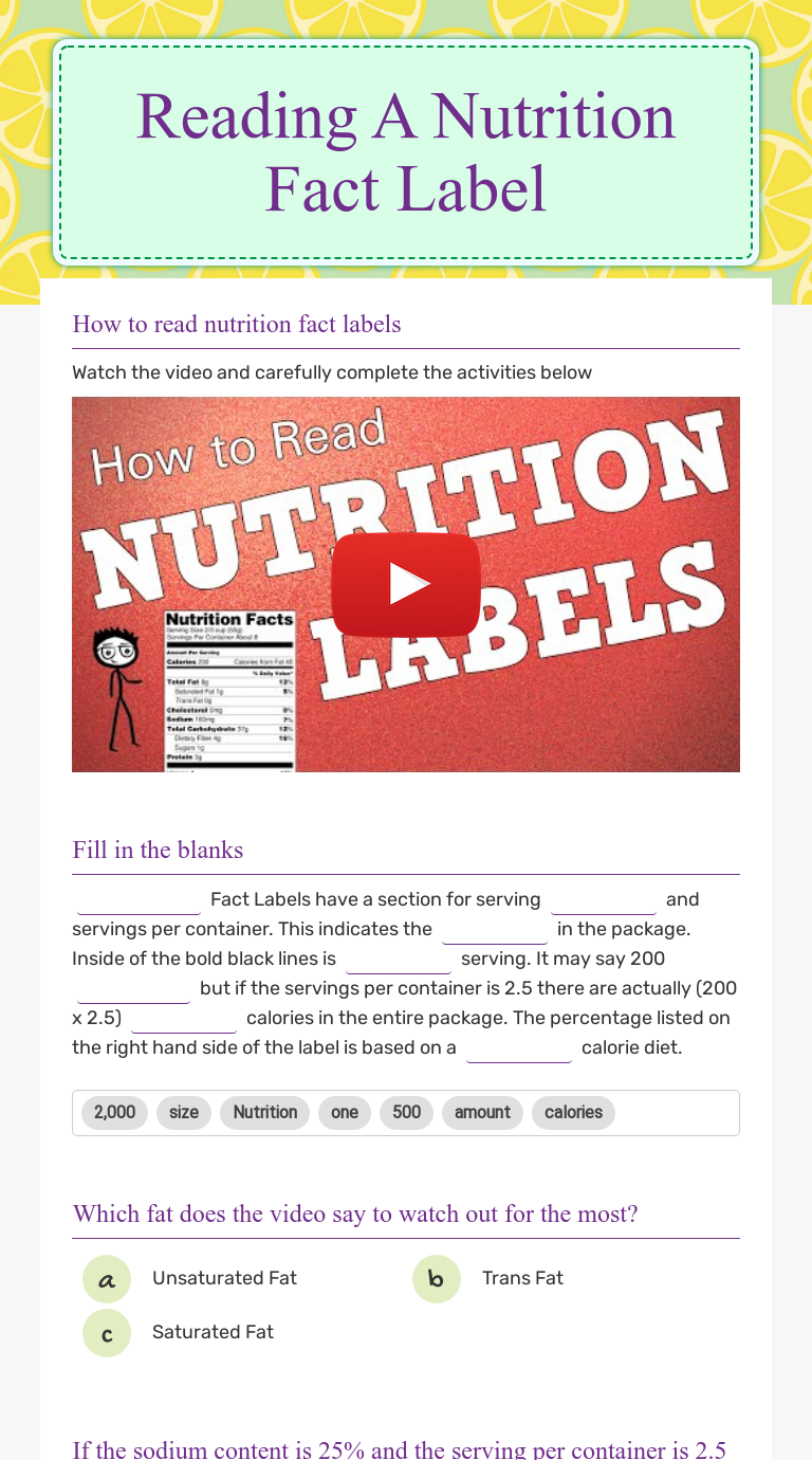 Reading A Food Label Worksheets & Teaching Resources | TpT It can be used in conjunction with the Reading & Interpreting a Nutrition Facts Label Powerpoint available in my store or as an activity/assessment on its own. The label include. Subjects: ... This Reading A Food Label Bundle includes:Editable Note Taking Guide (Google Docs)Thorough 7-Page Lesson Sequence with all talking points (PDF)Editable ...