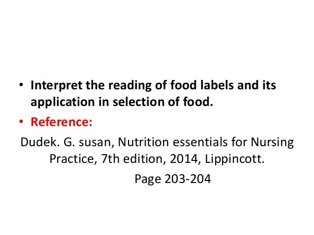 Interpret the reading of food labels and its - SlideShare 1. food labels and its application in selection of food 2. • Interpret the reading of food labels and its application in selection of food. • Reference: Dudek. G. susan, Nutrition essentials for Nursing Practice, 7th edition, 2014, Lippincott. Page 203-204 3.
