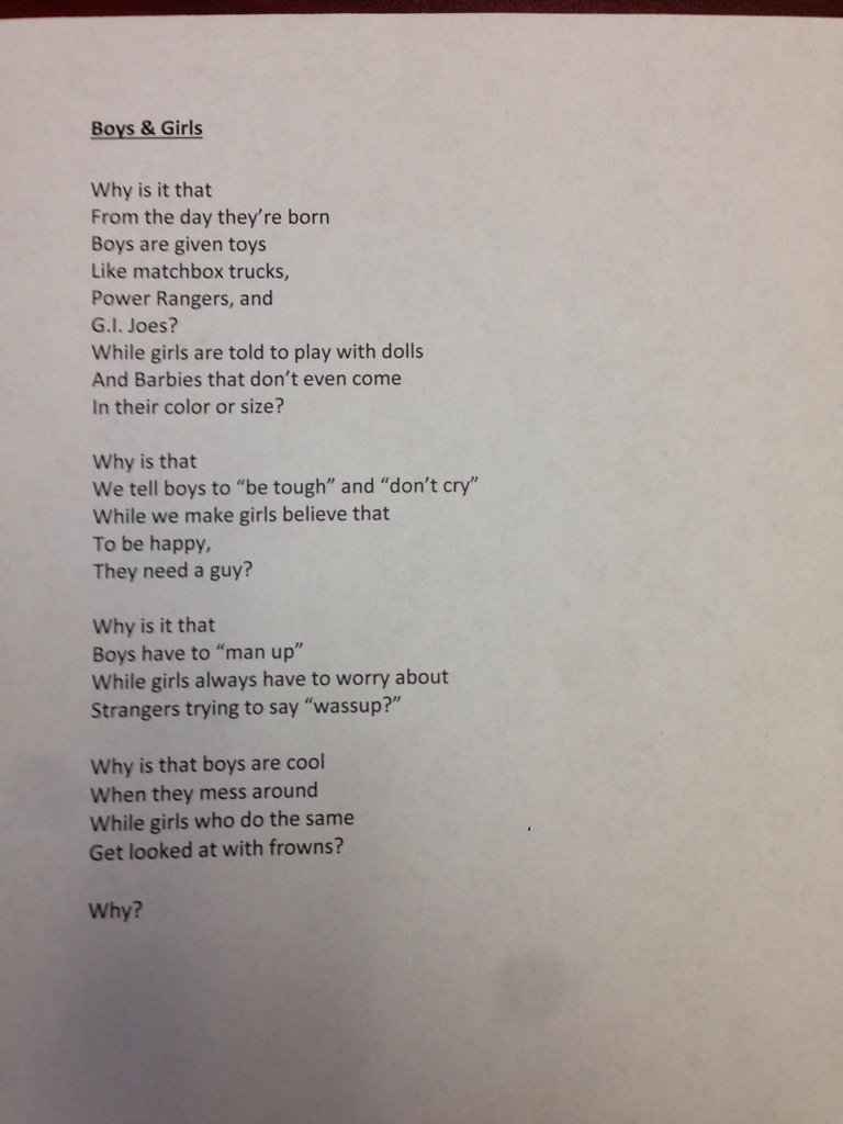 Labels And Stereotypes - 382 Words | Bartleby The Impact of Stereotypes on Society Martina Navratilova once said, "Labels are for clothing, labels are not for people" (Navratilova). Stereotypes are labels we give to people. Society thinks it's acceptable to give others labels based on their looks, way of living, etc. We live in a world full of stereotypes, they are everywhere. › resource-library › holocaustThe Holocaust: Bearing Witness | Facing History and Ourselves Mar 14, 2018 · Holocaust survivor Sonia Weitz begins her poem “For Yom Ha’Shoah” with these lines: “Come, take this giant leap with me / into the other world...the other place / where language fails and imagery defies, / denies man’s consciousness...and dies / upon the altar of insanity.” 1 To study the history in this lesson is to take Weitz’s “giant leap.” 14 Feminist Poems to Inspire Strong Women - TCK Publishing These 14 poems offer reflections on the female experience and the strength of women. 1. "Still I Rise" by Maya Angelou "Still I Rise" was written by the iconic Maya Angelou in 1978. It champions womanhood, sexuality, and rising above oppression, as we can see in this excerpt: You may write me down in history With your bitter, twisted lies, Stereotyping Poems - Modern Award-winning Stereotyping Poetry : All Poetry Society Wants to Label People Society wants to stick me into a chair and label me. I think it is hilarious. I have an identical twin. If they gave us each ten labels, we would not end up with a single one that is the same. We have the same face, laugh, voice, and mannerisms. Society would not understand. For they are not us.